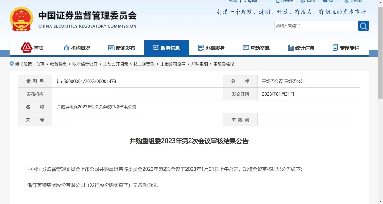 2023年1月31日,公司黨委書記、董事長應(yīng)徐頡帶領(lǐng)公司董事會秘書譚江、財務(wù)負(fù)責(zé)人金小波以及獨立財務(wù)顧問財通證券等中介機構(gòu)組成的答辯團(tuán)隊,向中國證監(jiān)會并購重組審核委員會就公司重大資產(chǎn)重組事項進(jìn)行了匯報和問題答辯,經(jīng)其審核,我司重大資產(chǎn)重組項目獲得無條件通過。